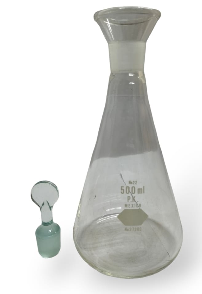 Matraz para determinaci?n de ?ndice de yodo. Fabricado con vidrio borosilicato. Capacidad de 500 ml , incluye tap?n de vidrio esmerilado n?mero 22. Adecuado para m?todos ASTM D-29 Y D-555. Dimensiones aproximadas di?metro 101 mm x 220 mm de altura.