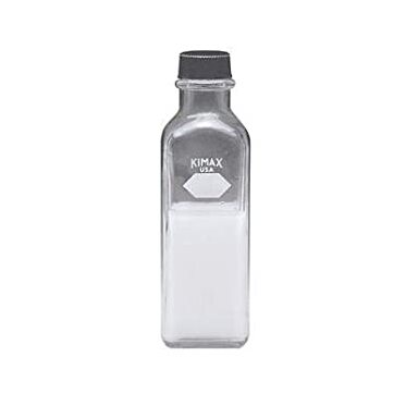Fabricada en vidrio de borosilicato, Tapón de rosca de plástico con revestimiento de goma cementada adecuado para autoclave hasta 249.8 °F, Útil para muestreo de agua y para el cultivo de tejidos, La botella tiene marca a nivel de 3.3 fl oz.