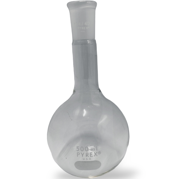 "Matraz Florencia 500mL con junta 24/40. Fondo plano. Cuello largo. Fabricado en vidrio de borosilicato conforme ASTM E438, Tipo I, Clase A. Medidas aproximadas: 103mm de diámetro x 195mm de altura."