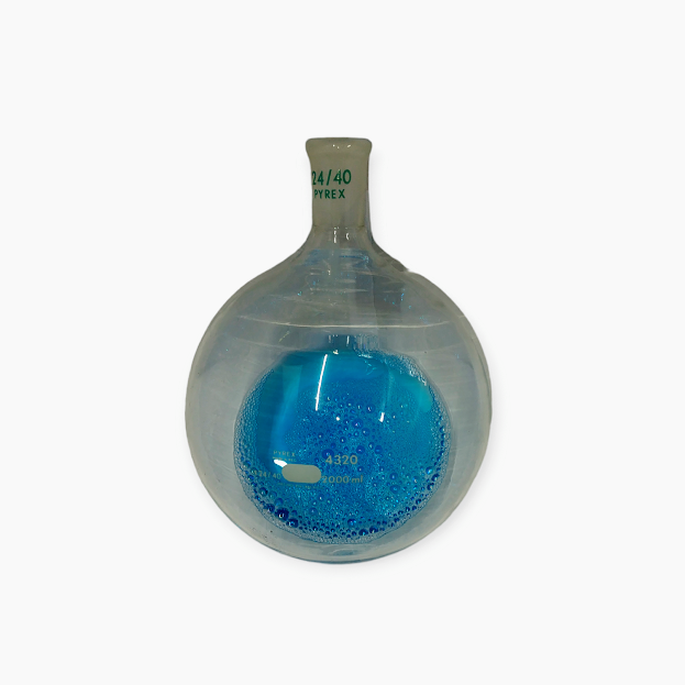 "Matraz de ebullición 2000mL con junta 24/40. Fondo redondo. Cuello corto. Fabricado en vidrio de borosilicato conforme ASTM E438, Tipo I, Clase A. Medidas aproximadas: 162mm de diámetro x 220mm de altura."