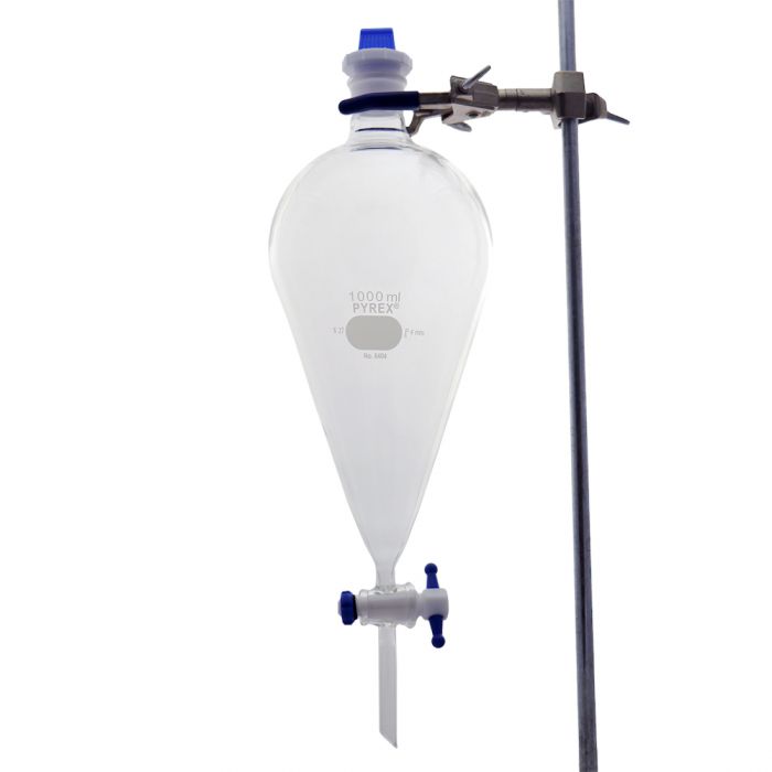 Embudo de separación de 1 lt en forma de pera, fabricado en vidrio borosilicato con tapón de polietileno de alta densidad y llave de teflón, capacidad 1 lt, tapón 27.