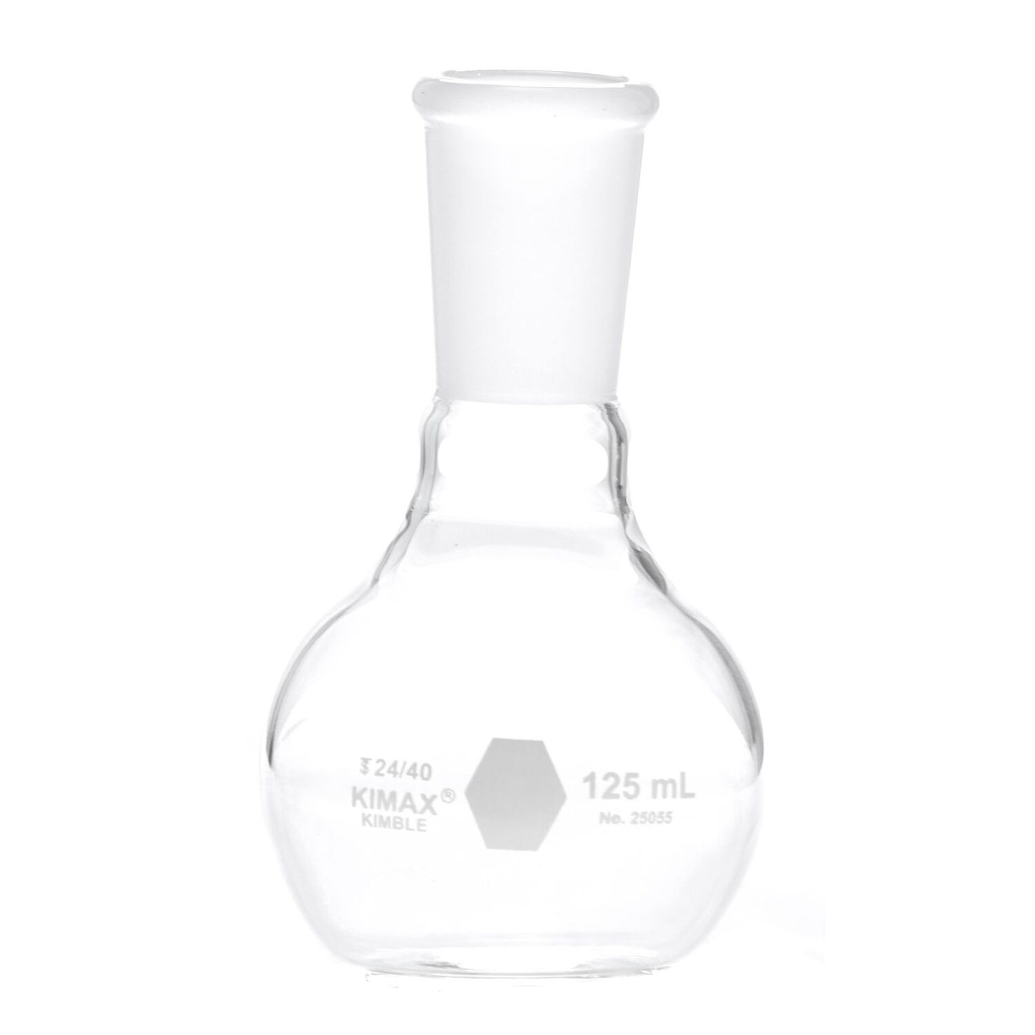 "Matraz de ebullición 125mL con junta 24/40. Fondo plano. Cuello corto. Fabricado en vidrio de borosilicato con bajo contenido de extractables; conforme a USP Tipo I y ASTM E438, Tipo I, Clase A. Diseñado conforme especificación ASTM E1403, Tipo I, Clase IV. Medidas aproximadas: 65mm de diámetro x 115mm de altura."
