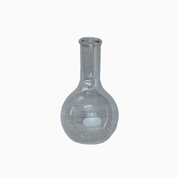 "Matraz de ebullición redondo fondo plano ( Florencia ) cuello largo capacidad 250 mL. Dimensiones 82 mm diámetro x 134 mm altura. Fabricado con vidrio borosilicato."