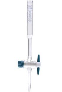 Fabricada en borosilicato. Bureta graduada de 10 ml. Clase A. Graduación en línea blanca. División de 0.5 ml. Llave de vidrio.
